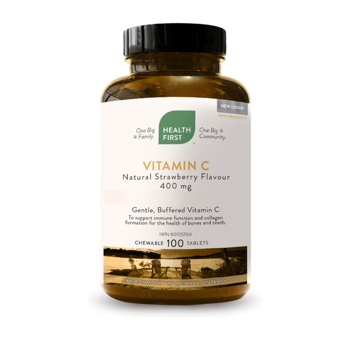 Chewable vitamin C tablets aren’t like they used to be! Vitamin C now comes in highly bioavailable and buffered forms like sodium ascorbate, which is more easily absorbed by our bodies. This buffered form is also gentler on our mouths, teeth, and digestive tracts. Health First Vitamin C Chewable contains 400 mg of vitamin C including sodium ascorbate. It’s vegan and free from magnesium stearate, dairy, soy, and yeast. It comes in a delicious, natural strawberry flavour that tastes like a fresh-picked strawberry, and is made with clean sweeteners, xylitol, and monk fruit. Health First Vitamin C Chewable is a catch-all for your health, healing, protection, and growth.